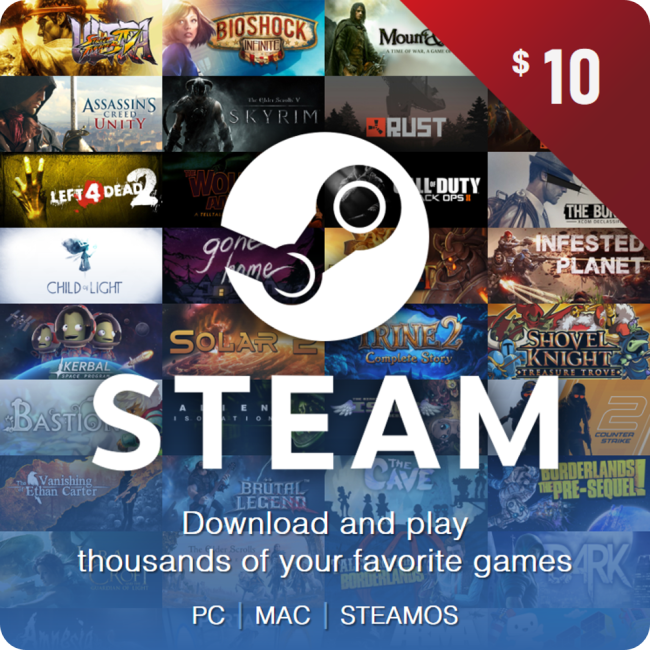 Подарочные карты Steam номиналом 10 долларов США используются для пополнения баланса кошелька Steam. Средства на счету в Steam Store можно использовать для покупки игр, программ и других продуктов доступных в Steam.