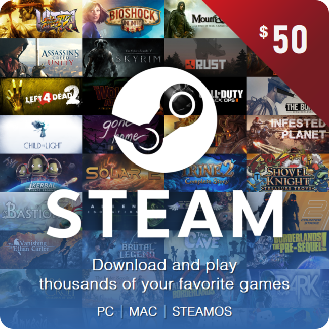 Подарочные карты Steam номиналом 50 долларов США используются для пополнения баланса кошелька Steam. Средства на счету в Steam Store можно использовать для покупки игр, программ и других продуктов доступных в Steam.
