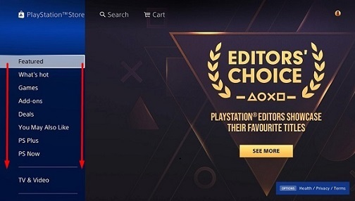 4. Перейдите в PS store. Попадя на главную страницу магазина, опуститесь в самый низ;