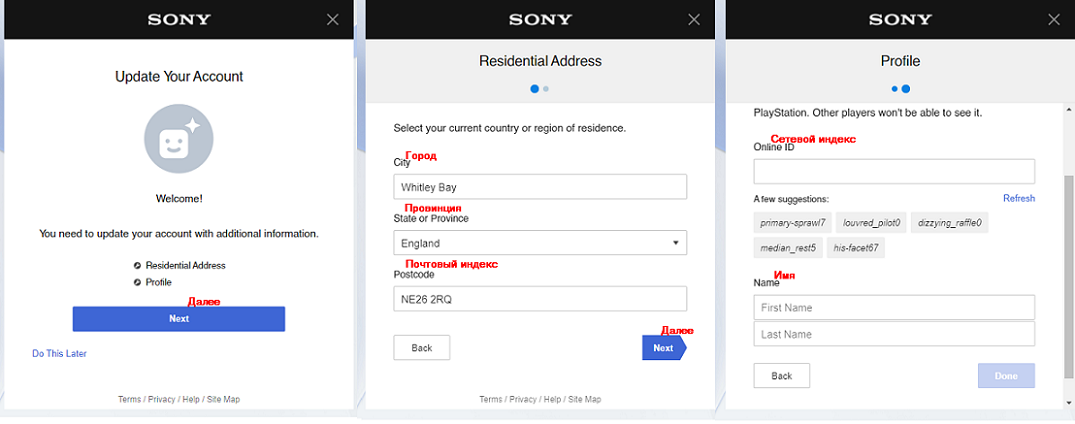 6. При вводе логина на сайте Sony, вас попросят ввести свой Никнейм и адрес.